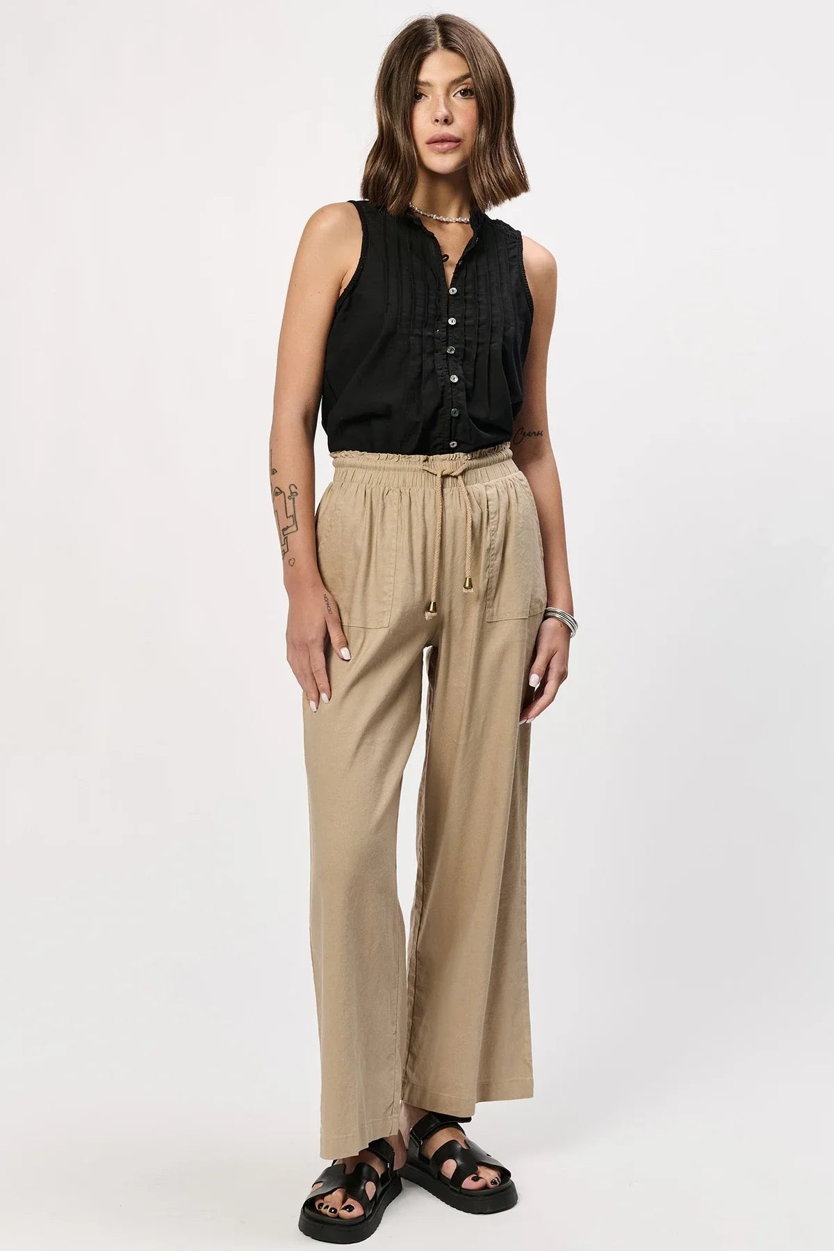 Crafted in a linen blend for a relaxed and breathable fit. These sandcastle color trousers feature a wide leg style with a ruffle waistband detail, offering both comfort and style for minimalist travel looks. Designed with a high-rise waist and pull-on closure, these pants provide ease and versatility. Perfect for spring, they include pockets and are machine washable to ensure convenience.