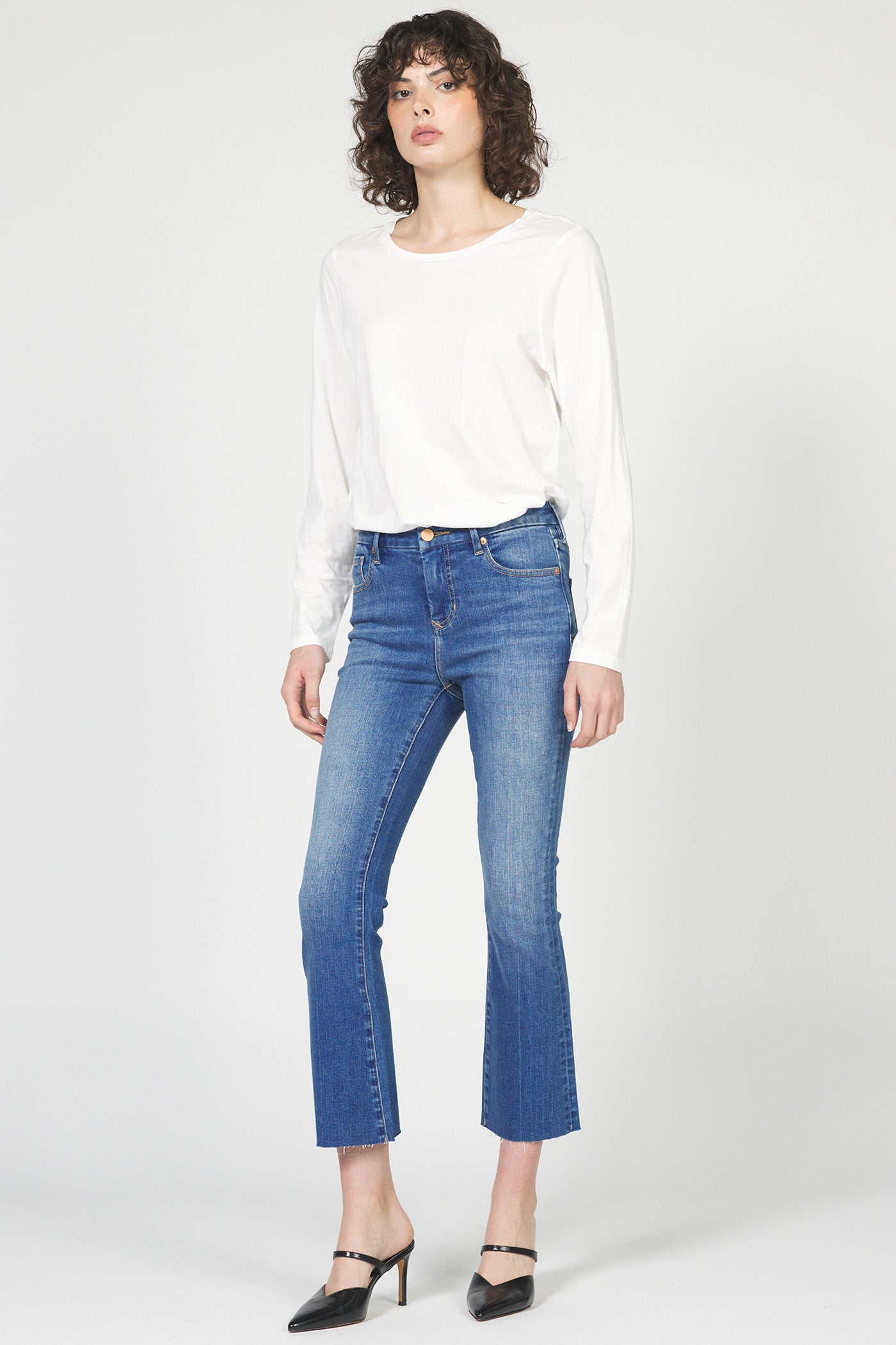 Mid rise cropped flare jeans. It's the graceful fit that sits at natural waist and fits skinny in the hips through the knee.