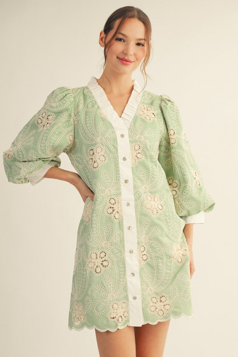 Embroidered pinstripe dress with puff sleeves with crochet lace accent and ruffled neckline