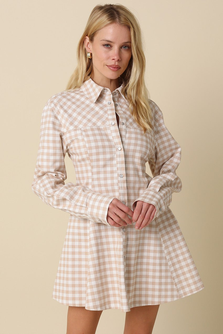 Gingham button front dress features a tailored fit-and-flare fit with a defined waist seam that flares into an A line skirt and a button front closure with a pointed collar for structure.