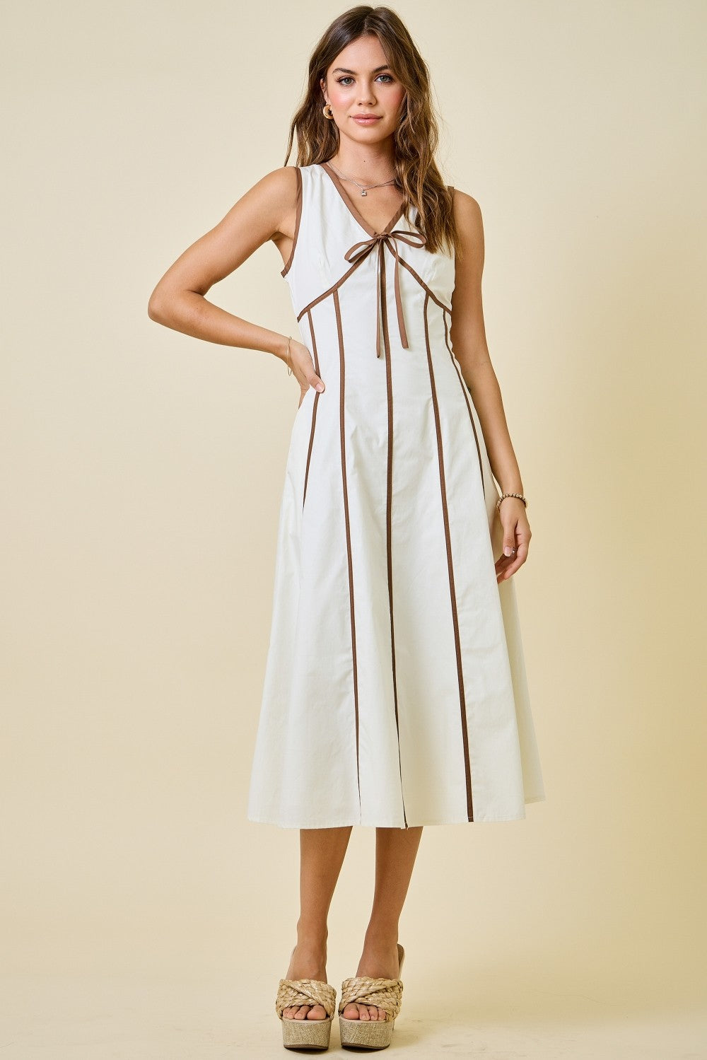 Sleeveless A line midi dress with contrast color detail.