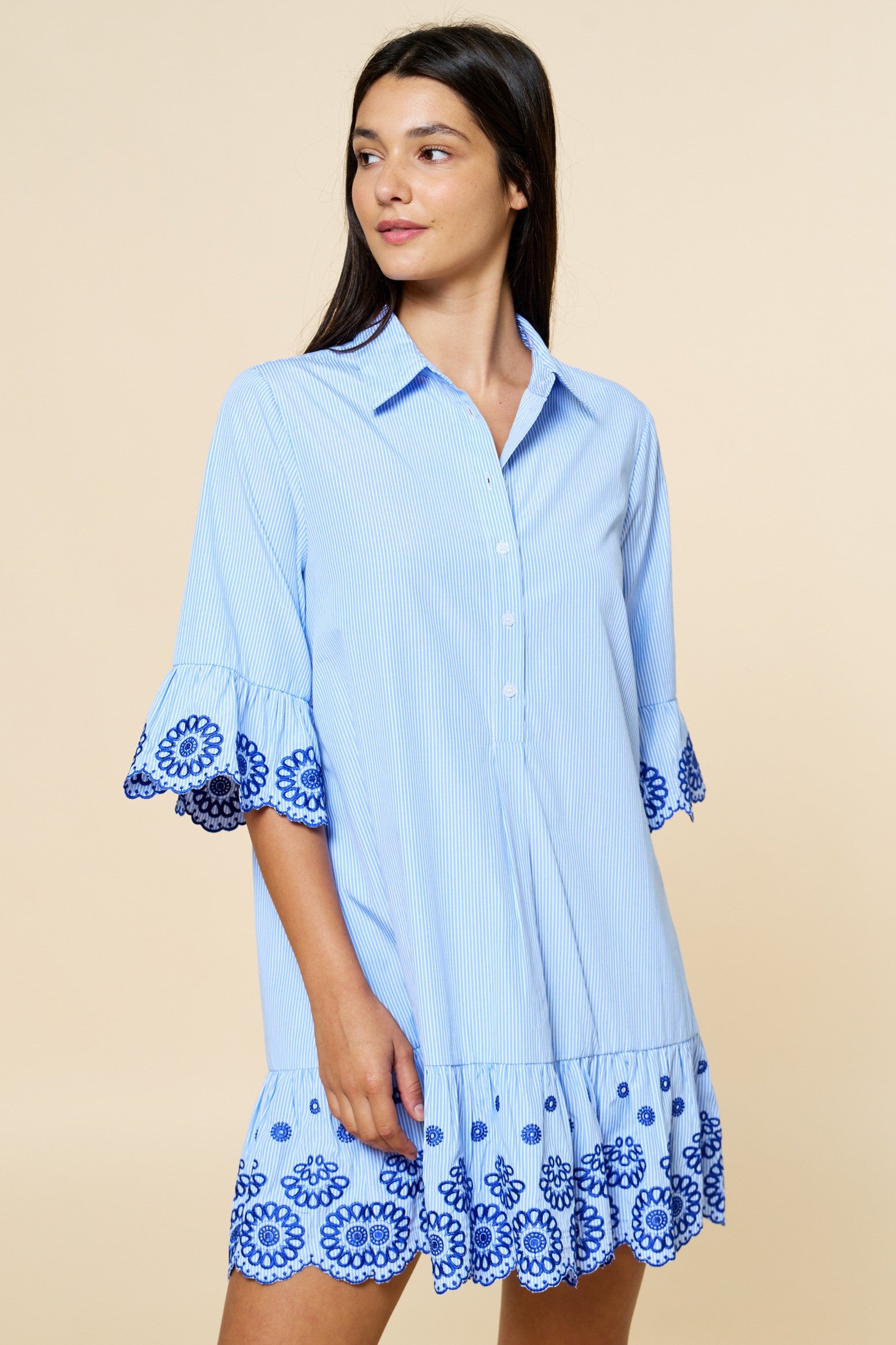 Stay stylishly relaxed in this scalloped floral embroidered shirt mini dress, featuring a collared neckline, halfway button-down front, and short sleeves. Designed with a loose fit, scalloped trim, and floral embroidered details over a striped print, this dress perfectly blends casual charm with chic elegance for spring and summer days.