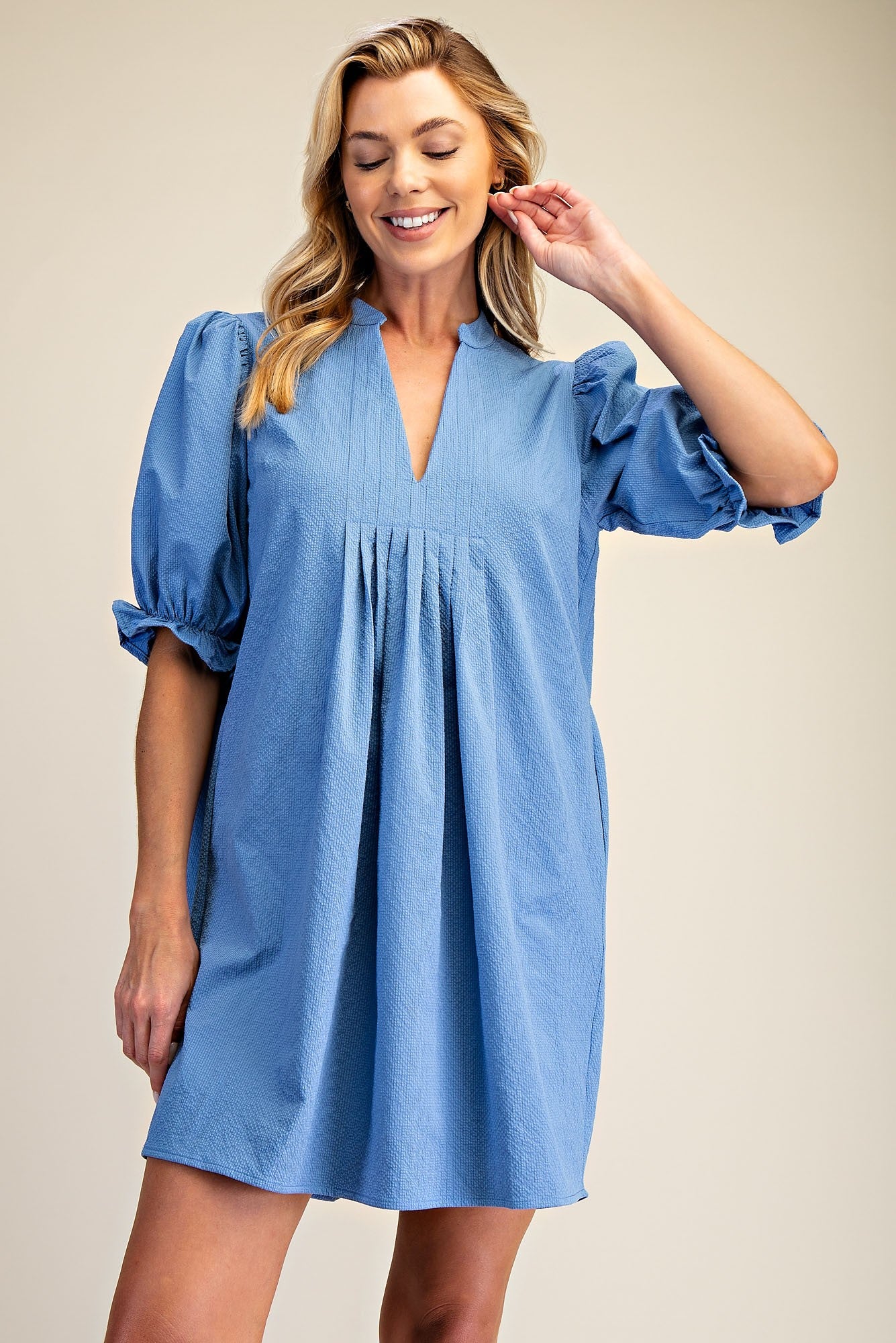 Puff sleeve, V neck, mini dress with cinched, short sleeves.
