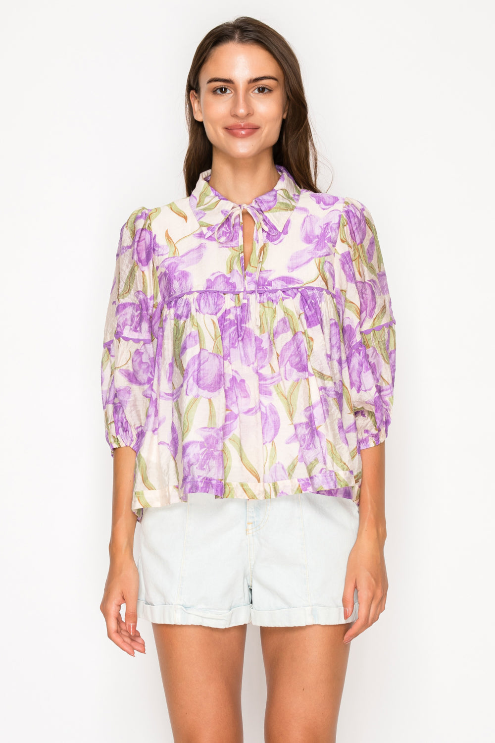 This stunning floral blouse captures the essence of a Grecian spring with its watercolor-inspired purple blooms. The effortless, tiered babydoll silhouette flows with every breezy step, while the collared tie-neck and romantic puff sleeves add a touch of timeless, feminine grace.