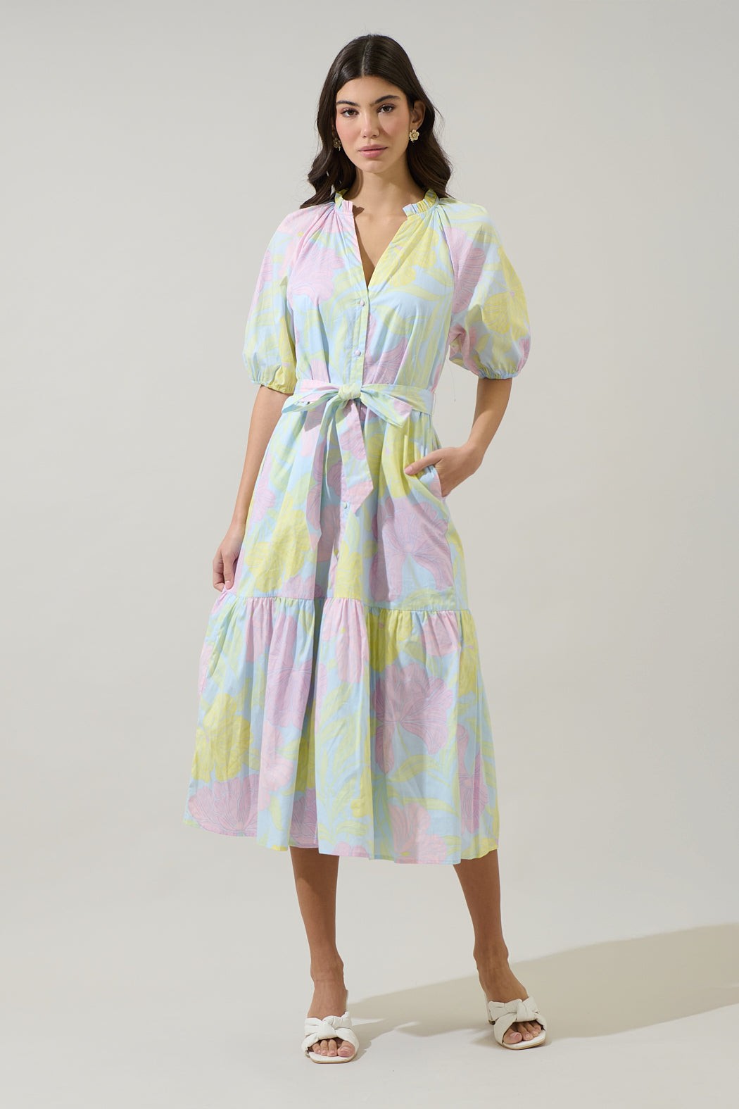 Start a good day wearing a mini dress. It features a split neckline followed by a ruffle mock neck and short puff sleeves. It has two tier layers and a loose fit.