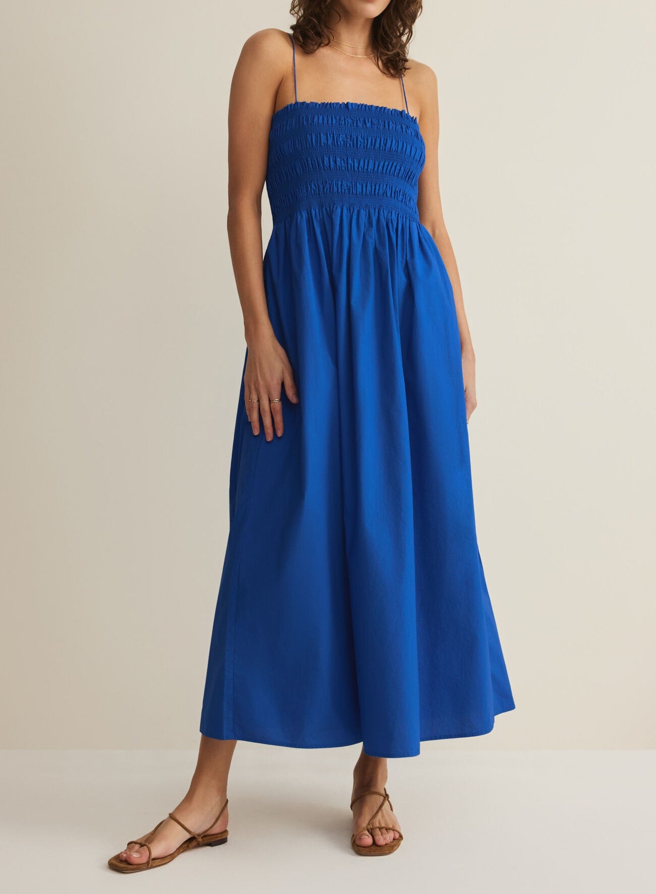 Made from lightweight cotton poplin, this midi dress features a fully smocked bodice that fits close to the body before flowing into a relaxed skirt. The square neckline and side pockets make it as practical as it is pretty.