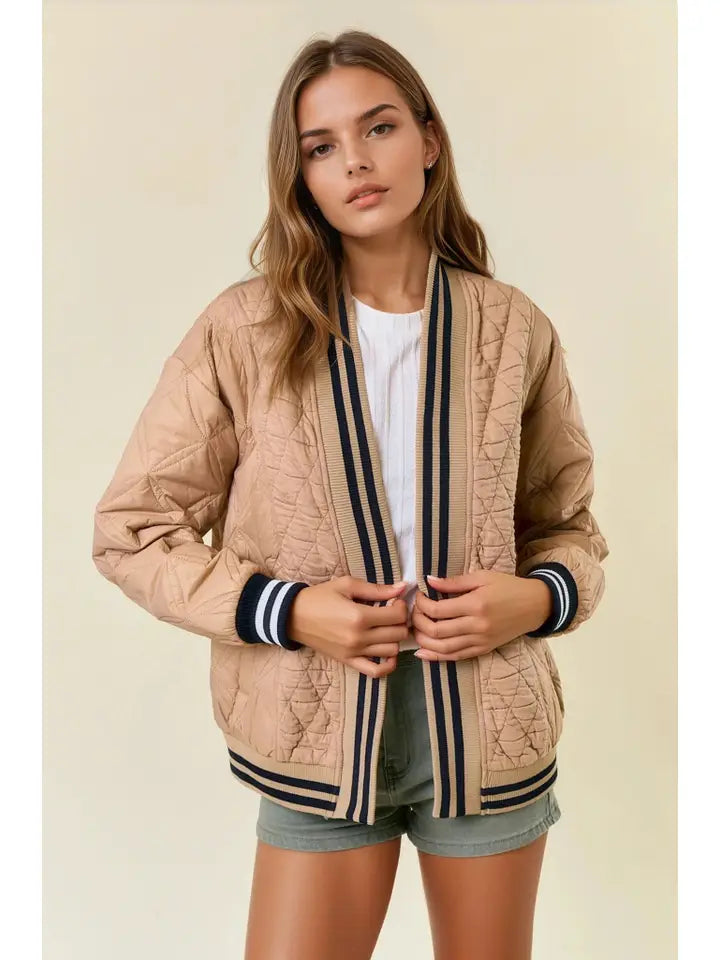 Quilted, open cardigan with side, slant pockets and ribbed trim with striped detailing on cuffs and hem.