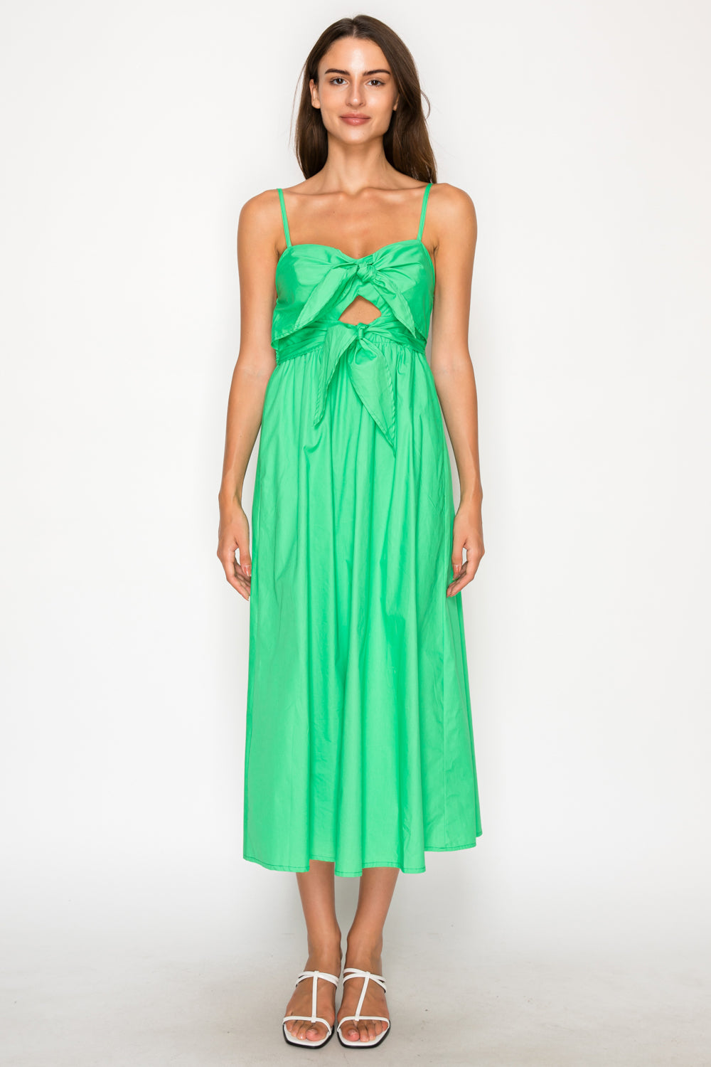 Poplin midi dress with bow tie front and sweetheart neckline.