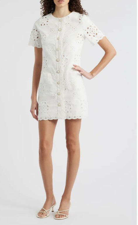 A diagonal grid of airy eyelet flowers brings warm-weather appeal to this shift-style minidress edged with embroidered, scalloped hems, while gold-rimmed buttons line the front.
