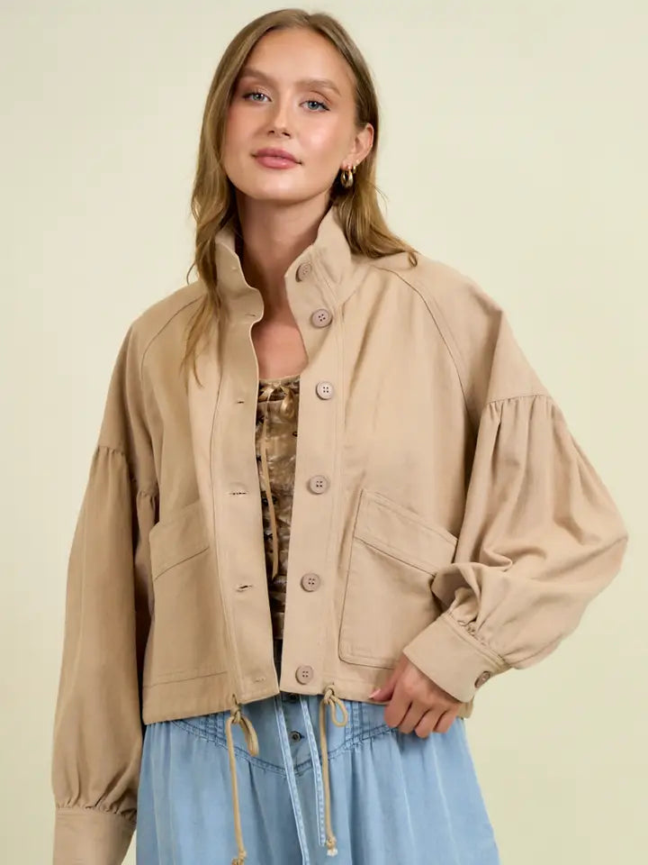 Blouson-style jacket with a cropped, boxy cut for a modern look. Features a stand collar and button-front closure for versatile styling.
