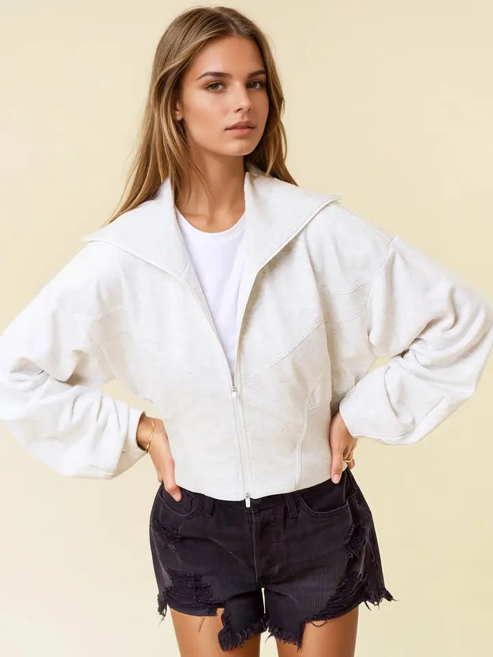 Fleece front, cropped jacket design has a trendy, modern look. With a front zip closure and high collar for added warmth and style