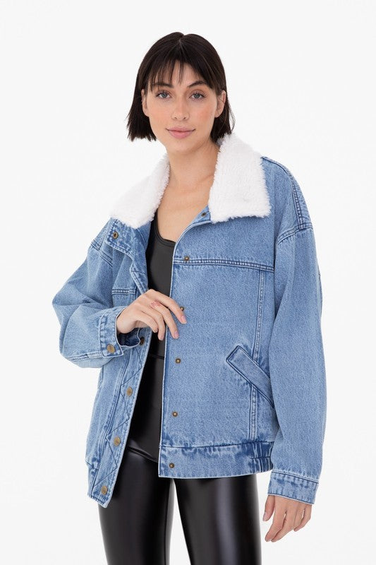 Sherpa collared, oversized denim jacket.
