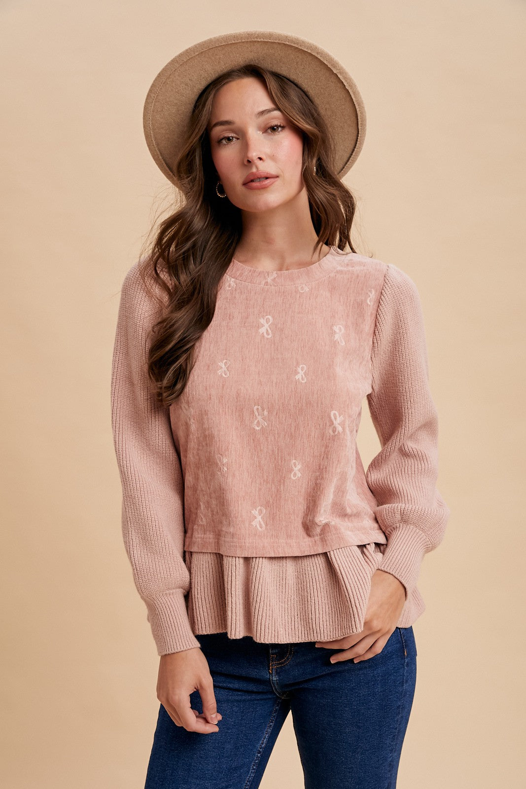 Mixed media top with velvet, bow bodice and textured sleeves.