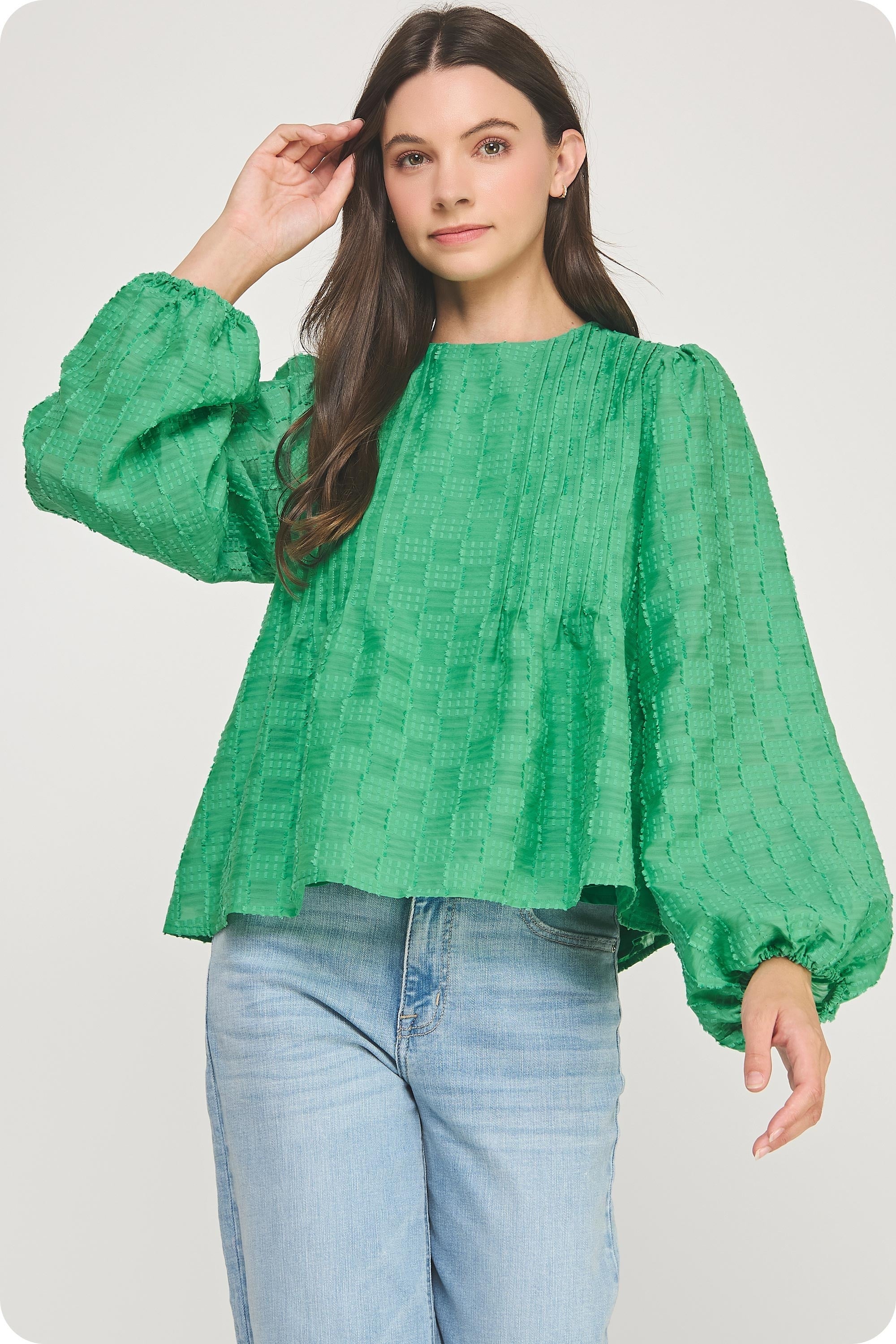 This relaxed top features puff sleeves, pin-tuck detail at front, elastic smocking at back waist, shirred shoulders, a relaxed fit, side pockets, round neck, and lining.
