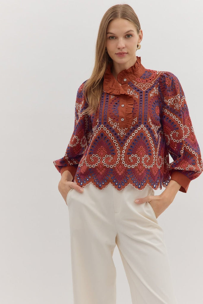 Embroidered, eyelet, three quarter, puff sleeve top with ruffled accent, split neck and button closure.
