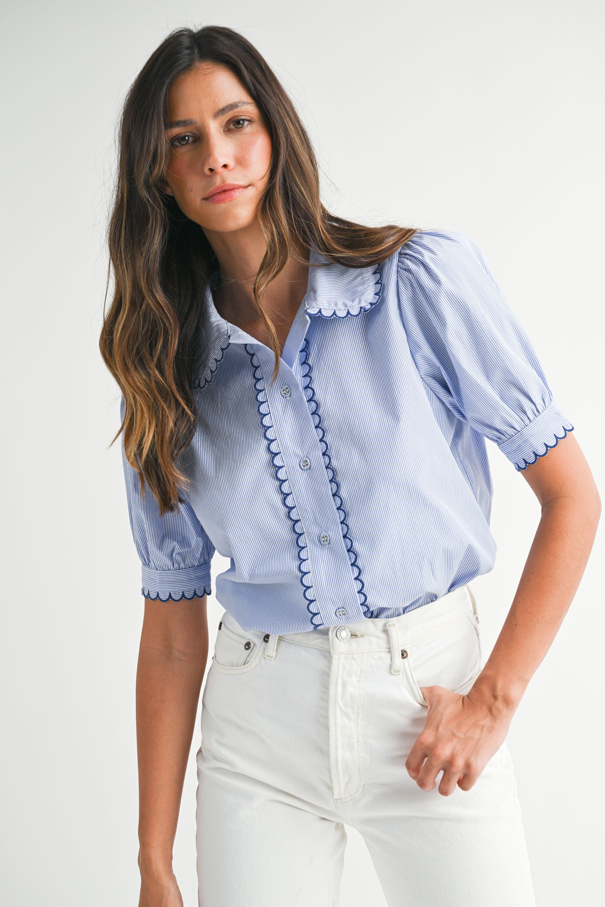 Striped, puff sleeve top with scallop edge and button front.