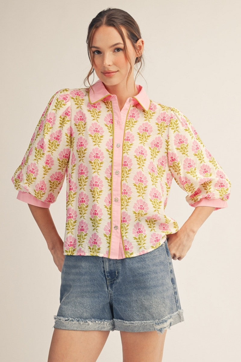 Floral, three quarter, puff sleeve, button down top with solid contrast, pipping detail.