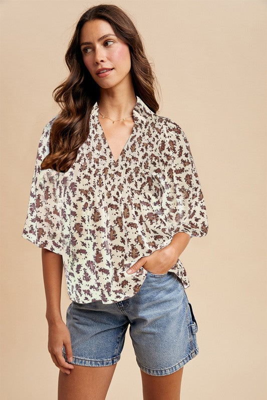 Floral, smocked top with balloon sleeves and collared, V neck.