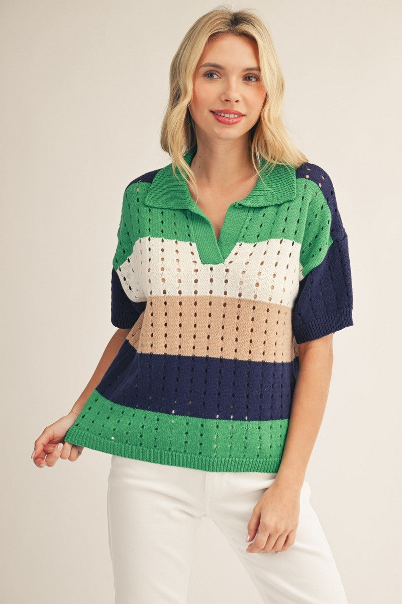 Drop shoulder, color block sweater with collar.