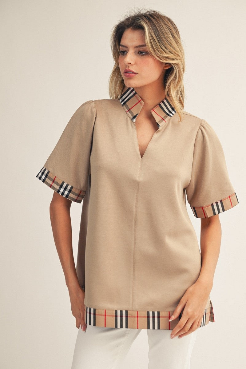 Short sleeve, standing neck top with plaid contrast accent and side slit.