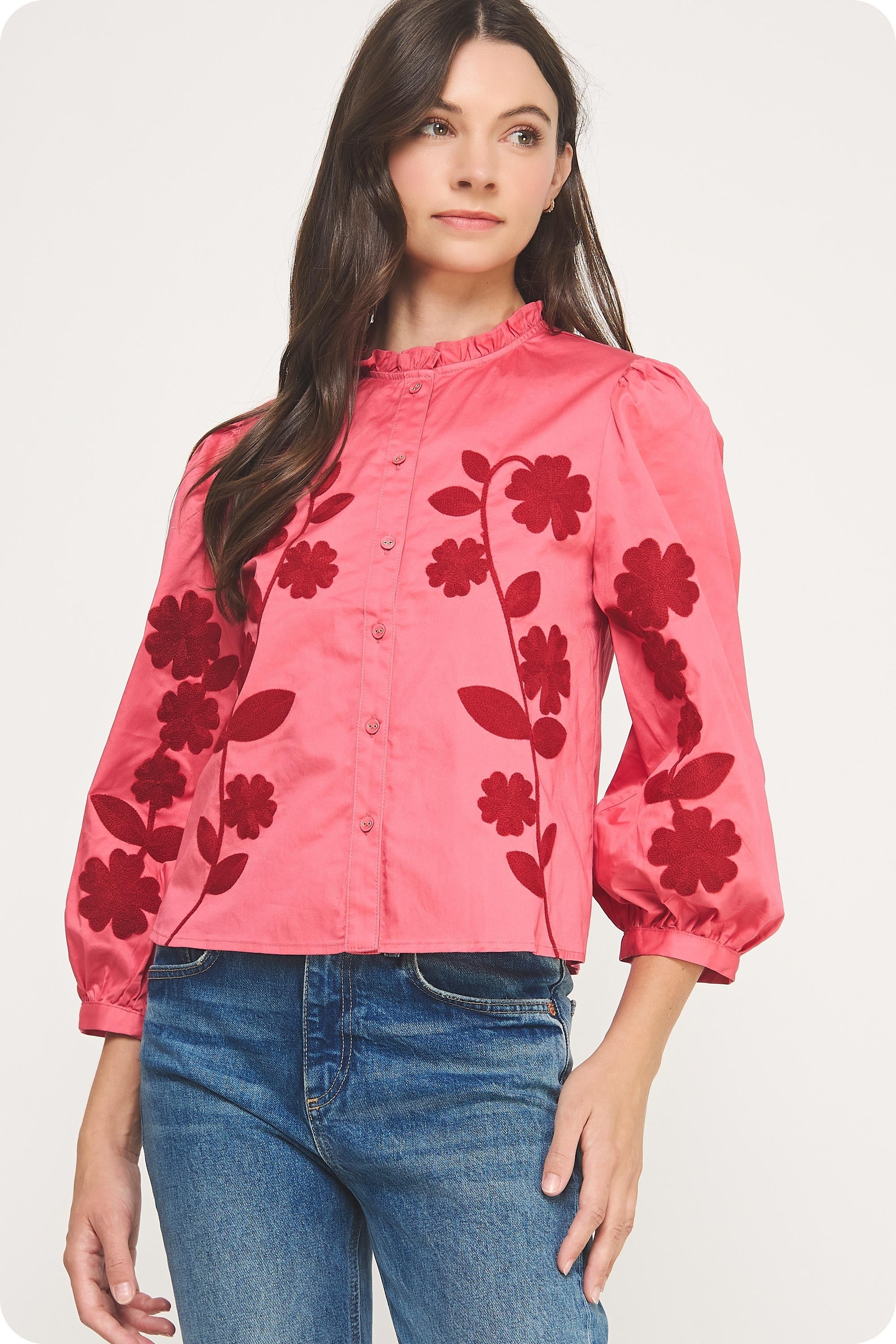 This button down top features a ruffled, mock neck, floral embroidery throughout, button closure at front, 3/4 puff sleeve with cuff, and shirred shoulder.
