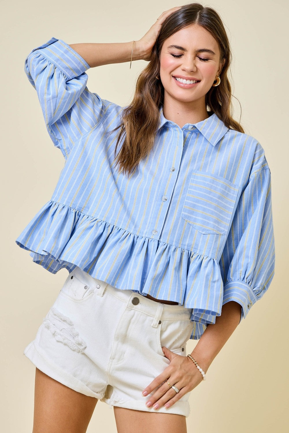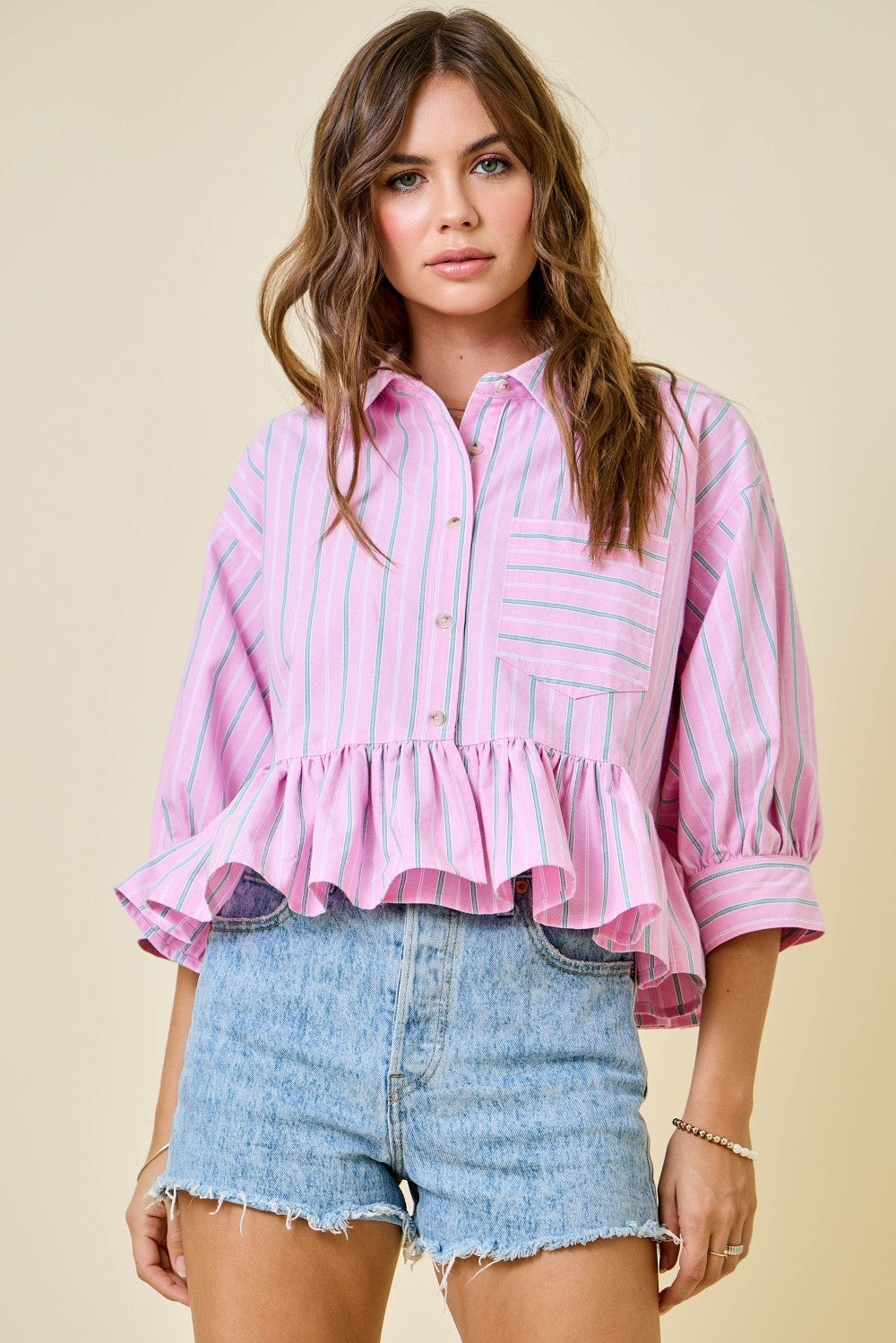 Boxy, striped, cropped top with three quarter sleeves and ruffled hem.