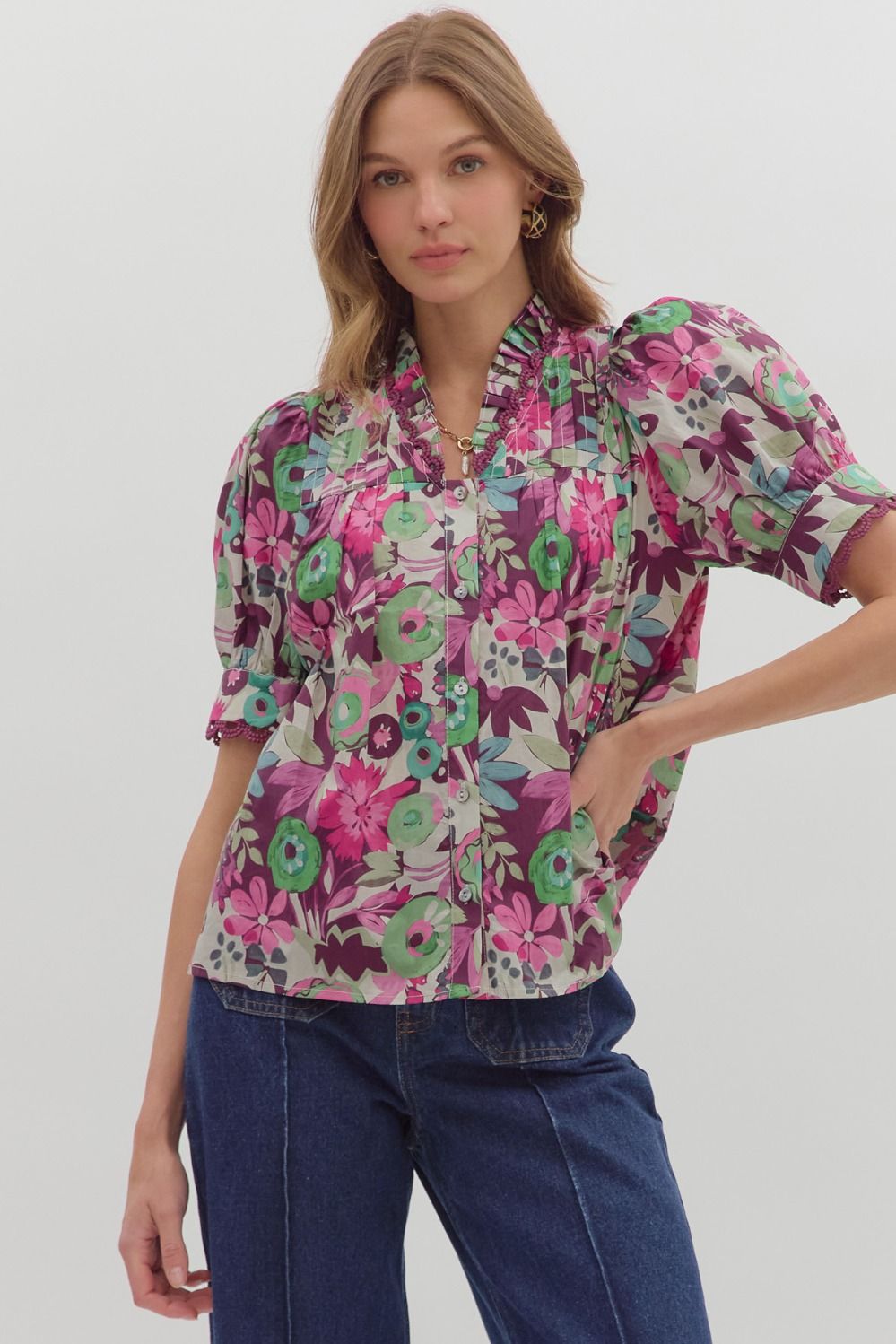 Floral, scallop trim top with puff sleeves and frilled V-neck, and pintuck yoke front panel.
