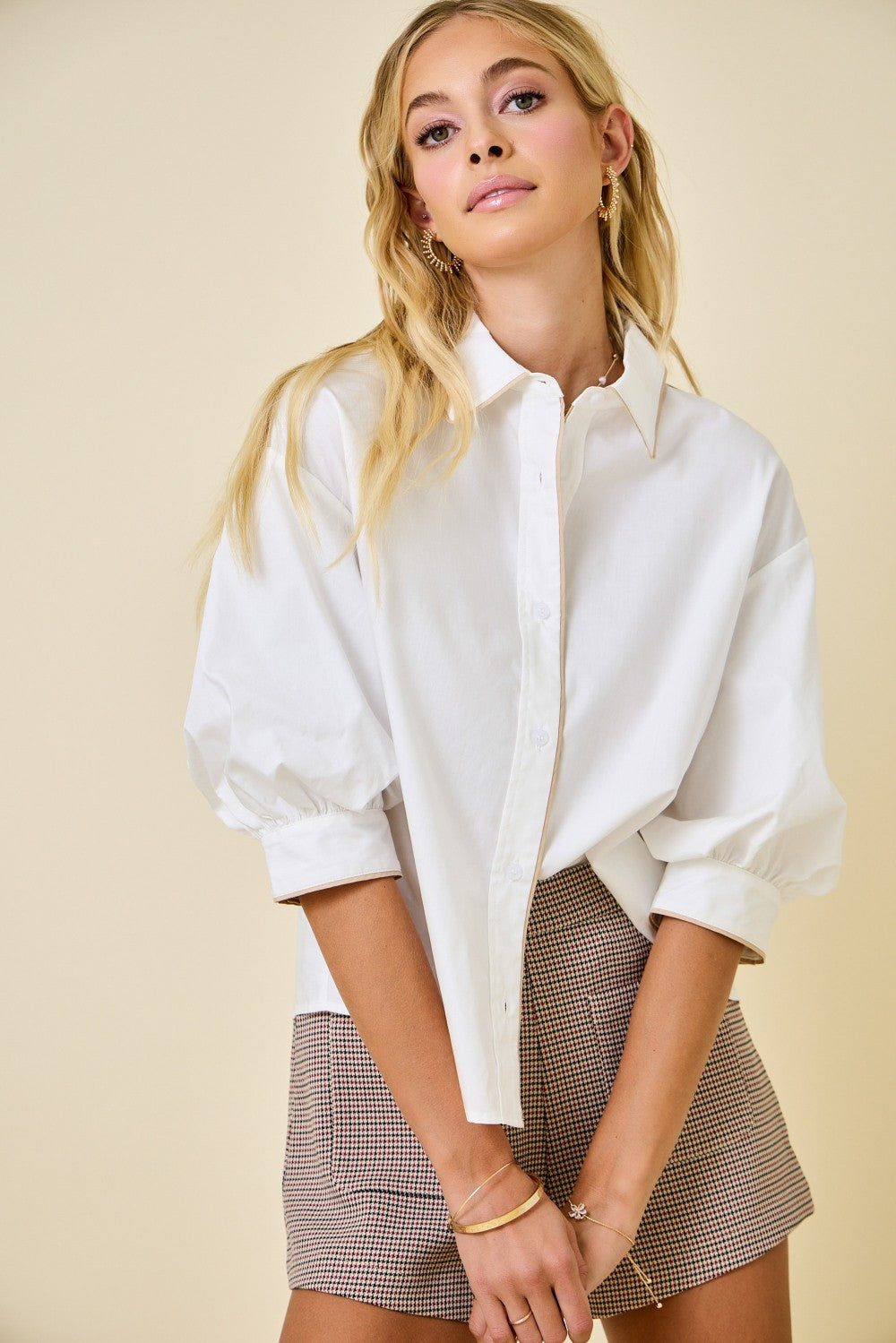 Button down top with bubble sleeves and contrast piping.