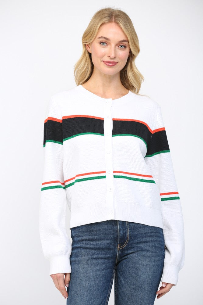Bold stripe, round neck cardigan sweater.