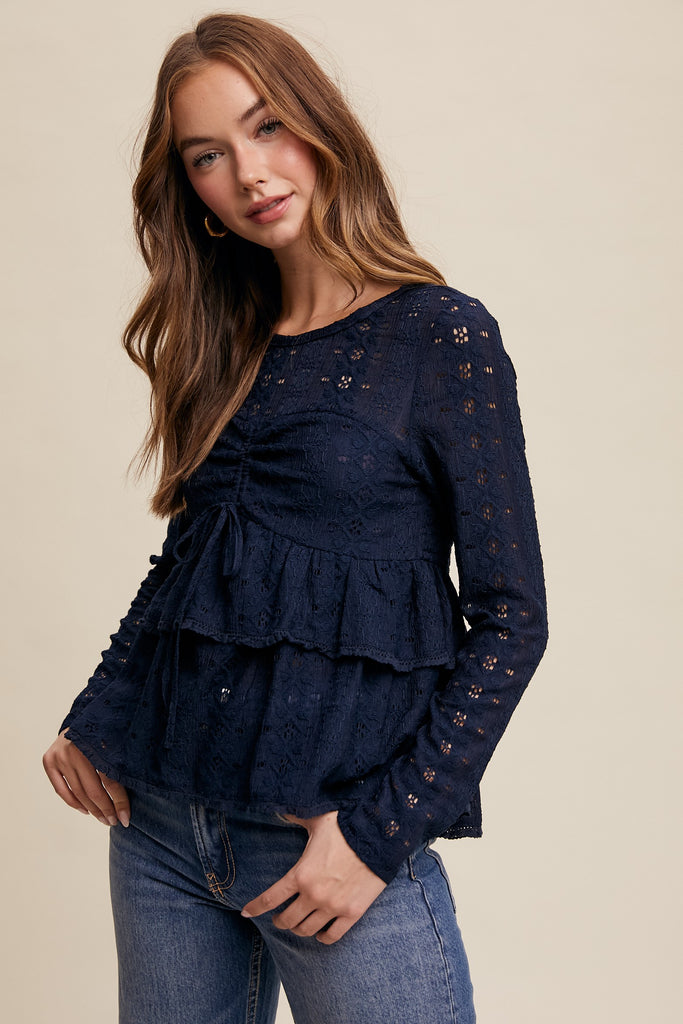 Delicate floral pattern top with layered ruffles and drawstring at bust.
