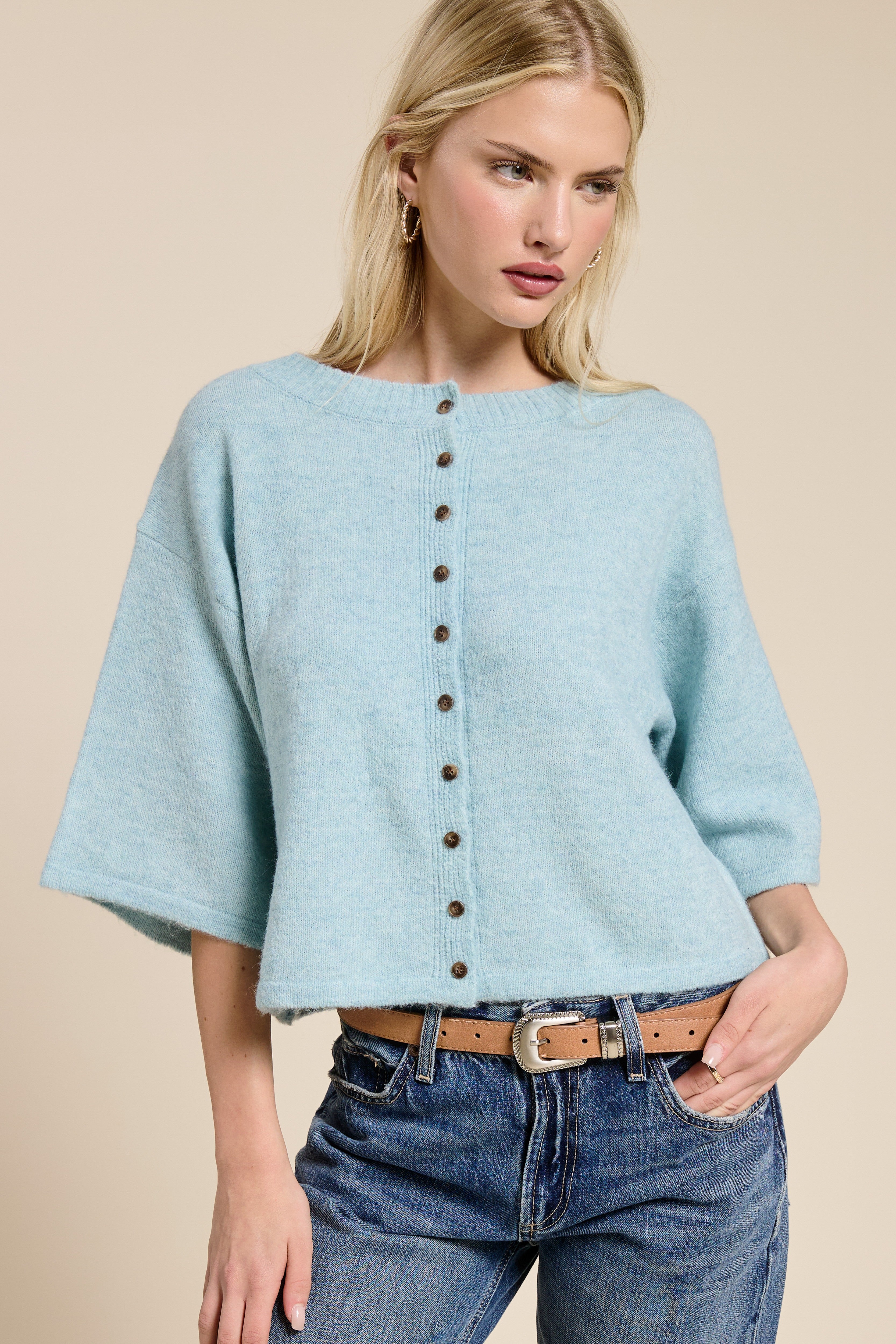 Crafted from a soft knit material, this button front cardigan blends comfort with a relaxed, modern silhouette. It features a boxy fit with wide elbow-length short sleeves, dropped shoulders, ribbed neckline, and a button front closure for an effortless everyday layer piece that transitions from weekday to weekend.