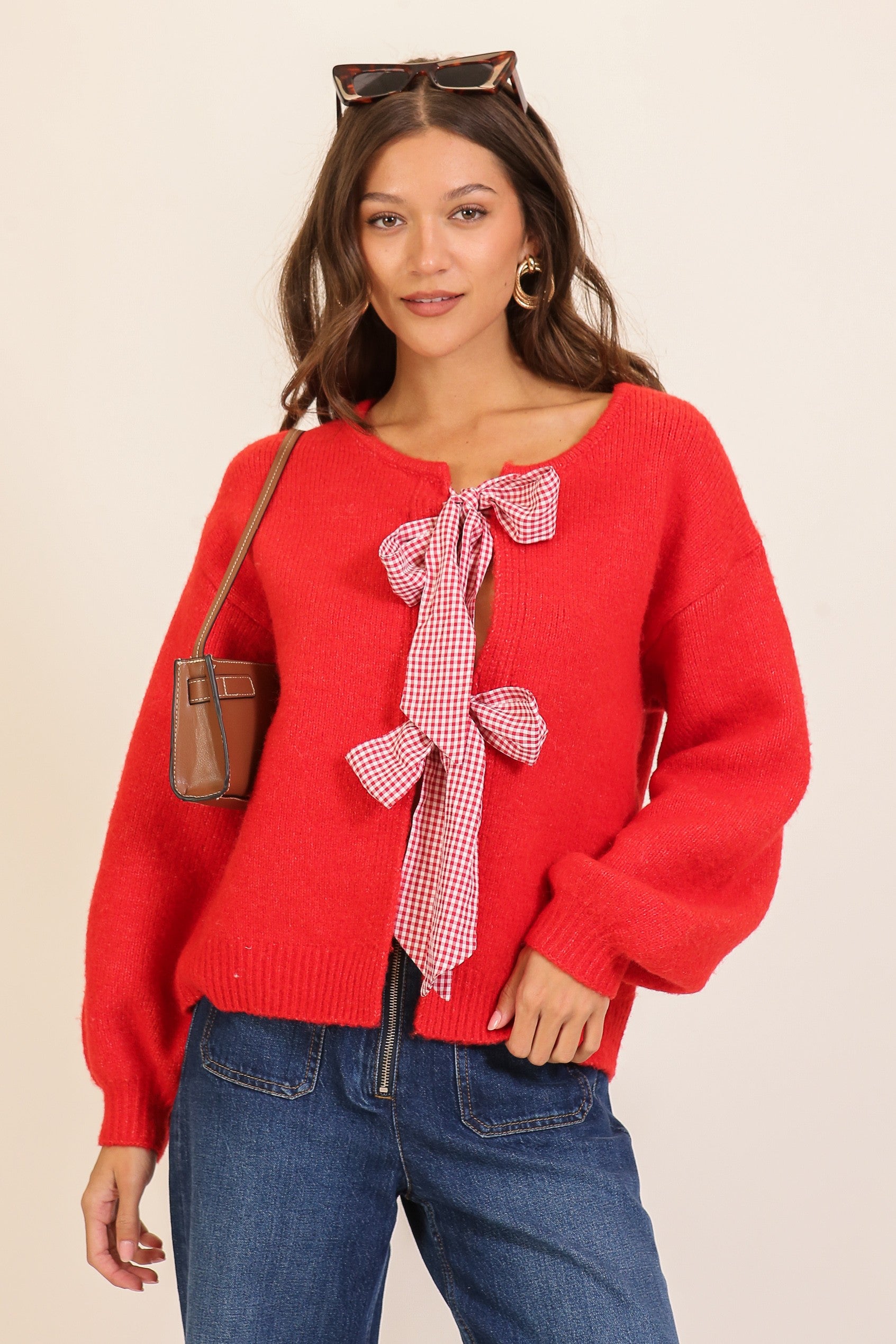 Designed in a vibrant red hue, this cozy sweater features a soft, plush knit paired with adorable gingham ribbon ties that create a playful front-bow closure.