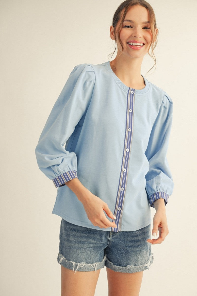 Three quarter sleeve, button down top with pleated puff shoulder and stripe contrast.