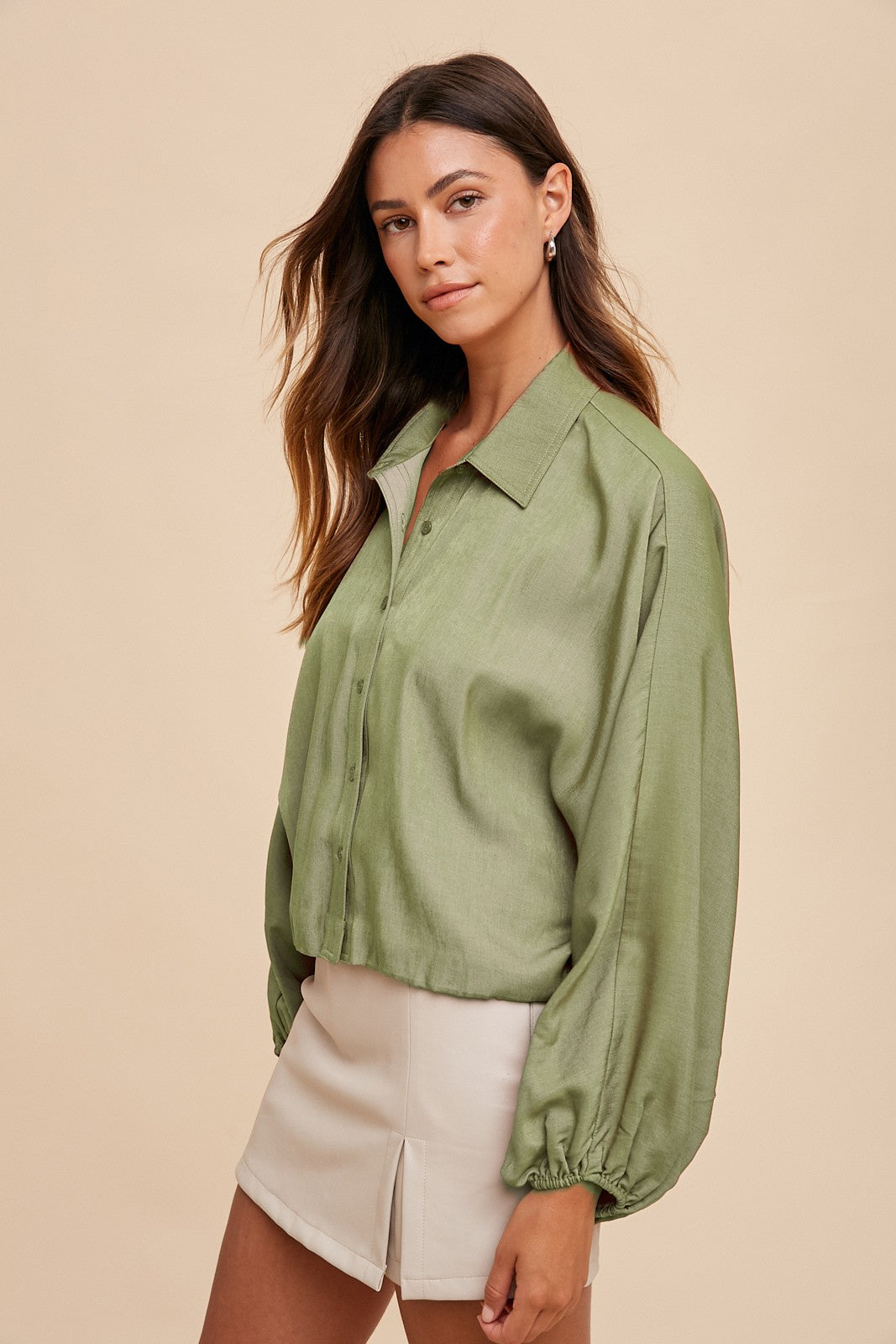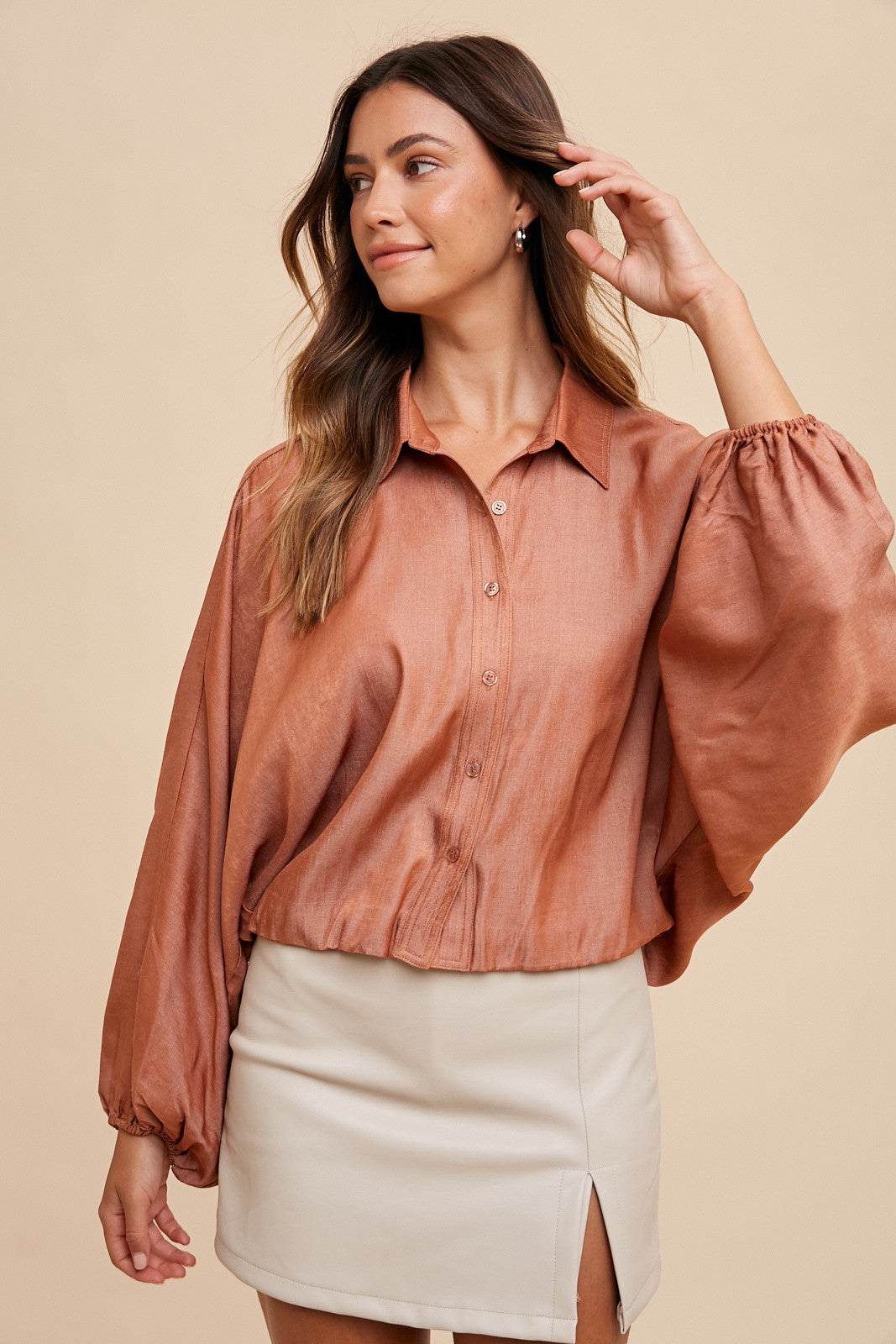Loose fit, button down top with balloon sleeves.