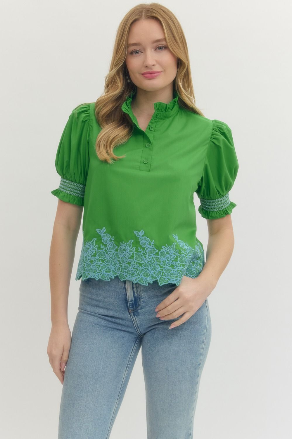 Solid top with embroidered, smocked sleeves and embroidered hem.