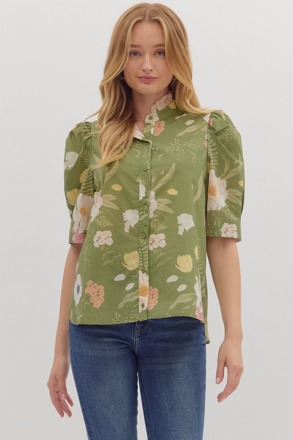 Floral top with ruffled neck and pleated, puff sleeves.