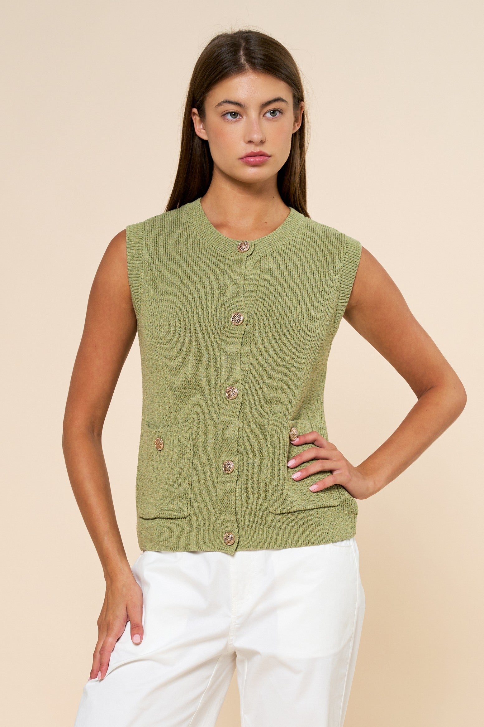 Button-down knit vest featuring a round neckline and sleeveless silhouette. Designed with front pockets accented by matching gold-tone buttons for a refined touch.