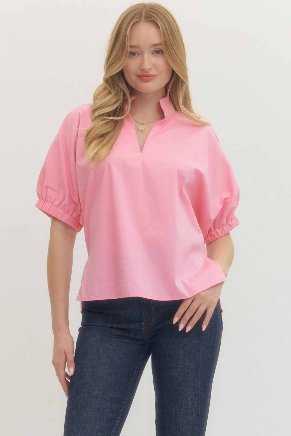 Solid, puff sleeve top featuring V-neck with standing collar.