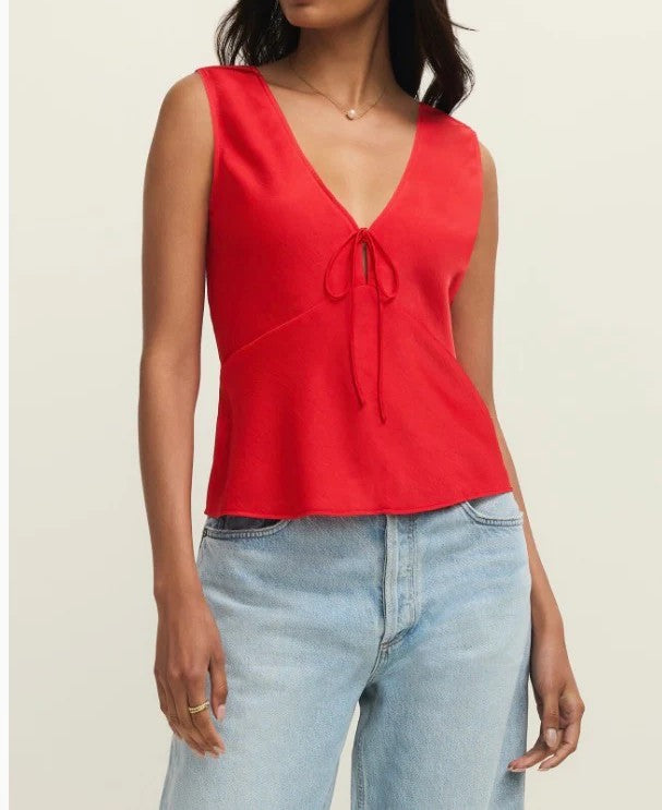 The Luana Top is a sleeveless, satin beauty with a flirty v-neck and a tie detail at the chest. Its flared hem adds a cute, dainty touch, making it perfect for date nights or fun days out with the gals snapping pics.
