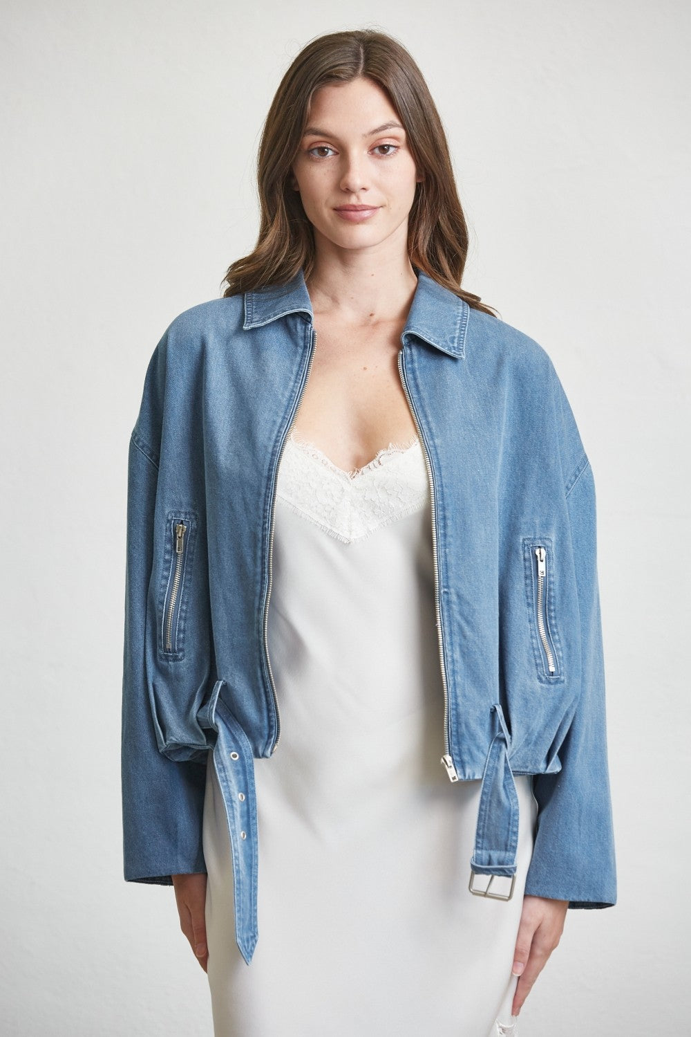 This relaxed zip-front denim jacket blends modern ease with subtly structured detailing, creating an effortlessly elevated outerwear staple. Designed with a soft drape and slightly oversized shape, it offers comfortable movement while maintaining a clean, refined silhouette.