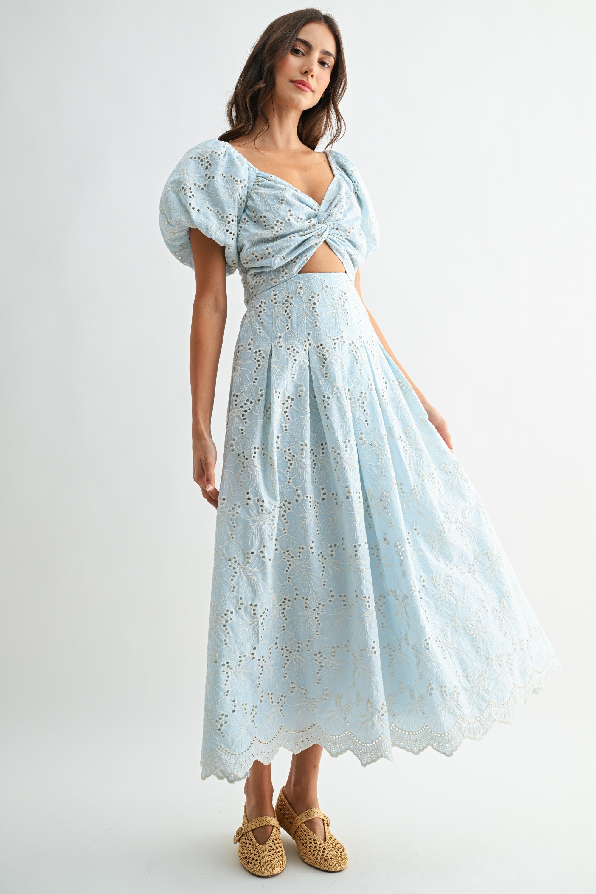 Eyelet maxi dress that with short puff sleeves, a twisted front bodice, and a modest cutout below the bust line.