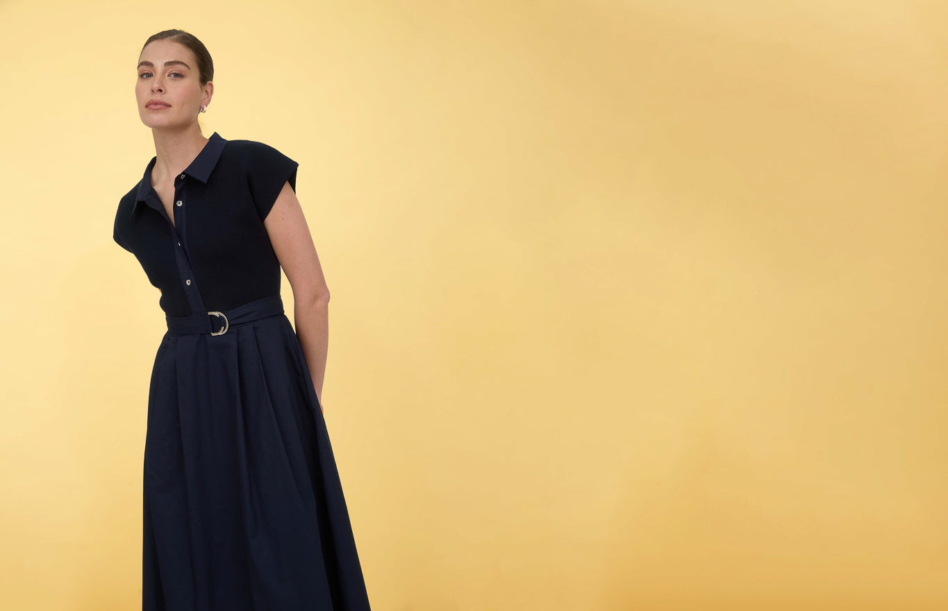 The Kimberly midi dress features a sophisticated button-front collar that adds polish and dimension, while the pleated skirt creates graceful movement and visual interest. A defined belted waist cinches the silhouette for a flattering, structured look. Perfect for work, weekend outings, or special occasions, this dress transitions seamlessly from day to evening with the right accessories.
