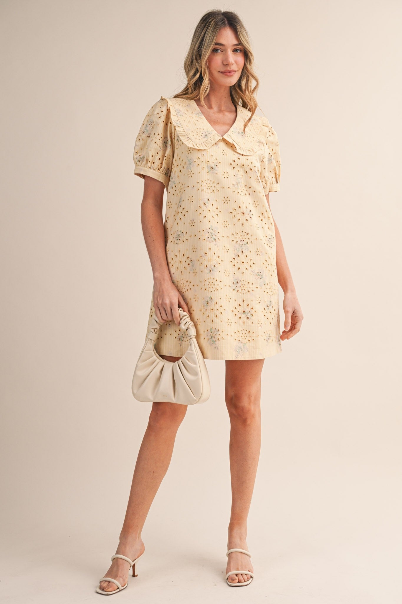 Ruffled, doll collar, floral eyelet mini dress with puff sleeves.