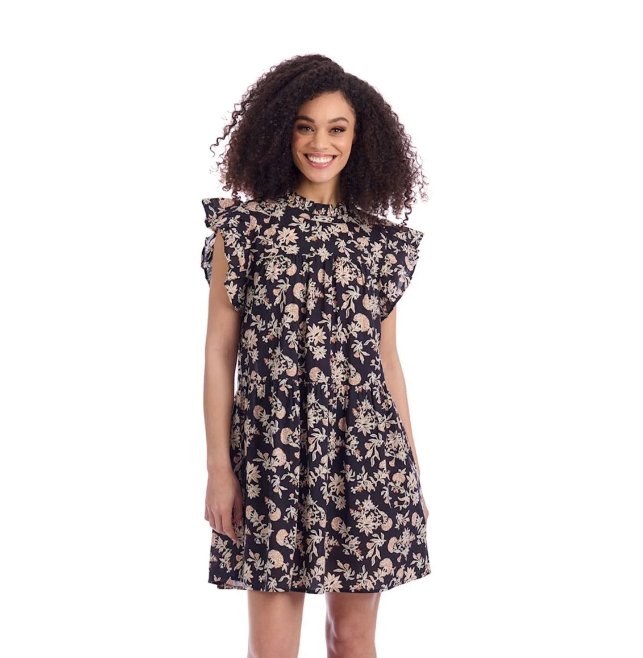 Cotton cambric dress features ruffle neck and short flutter sleeves.