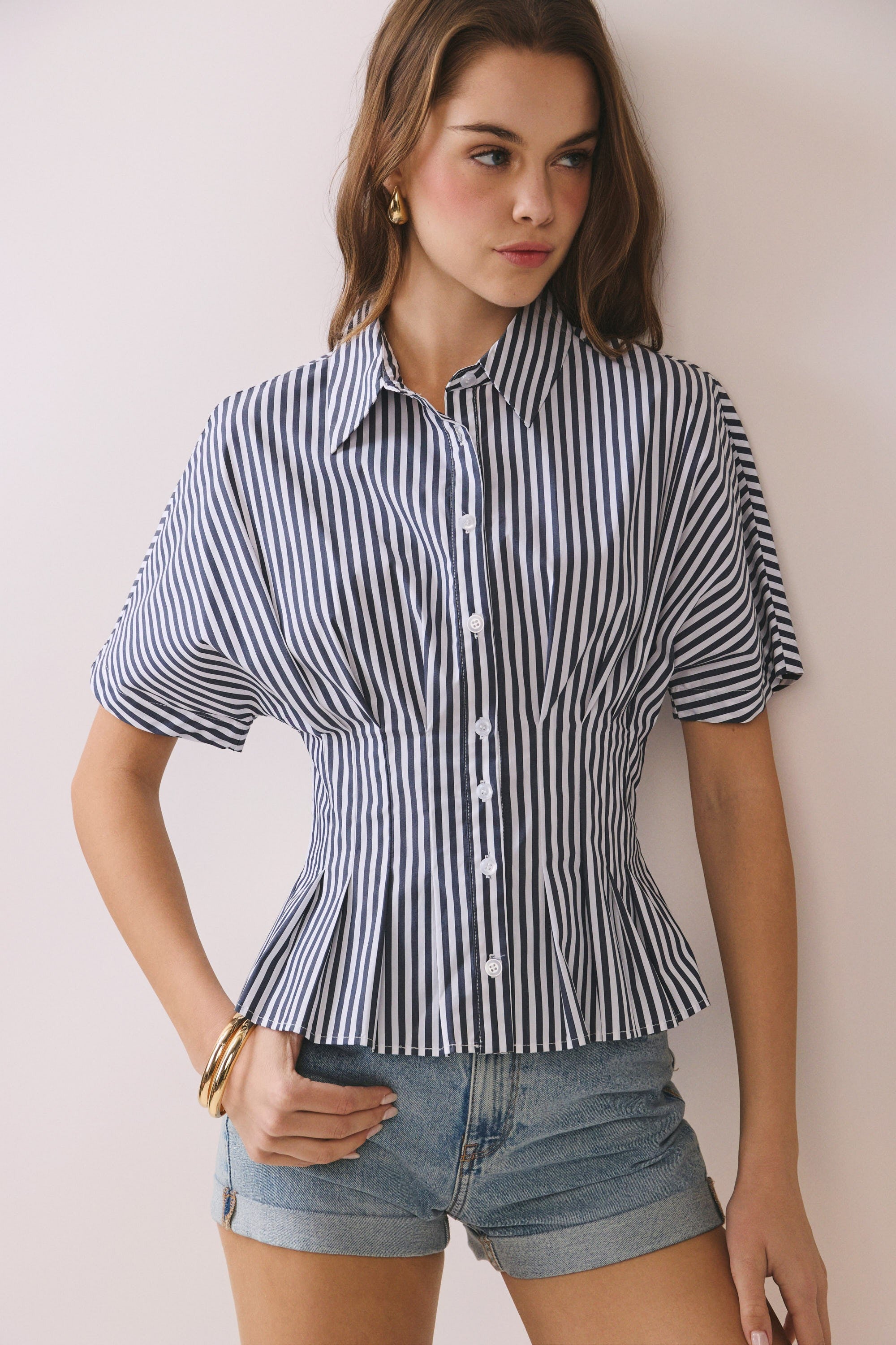 A striped woven shirt featuring a classic pointed collar and button up front. Designed with short sleeves and a fitted waist that flows into a subtle peplum hem for a flattering silhouette.