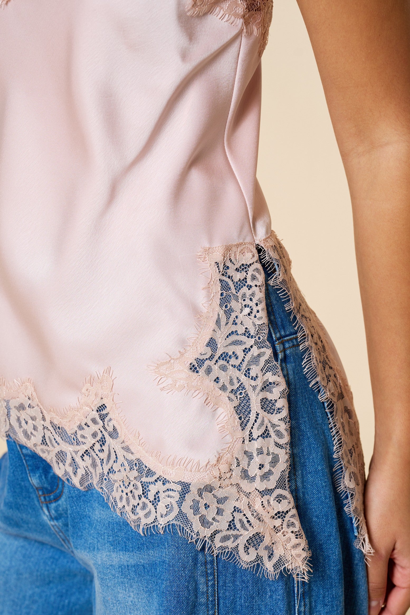 Chic and lightweight satin cami top featuring a flattering V-neckline with delicate lace trim. Designed with adjustable straps and a high-low asymmetrical hem for a modern silhouette.