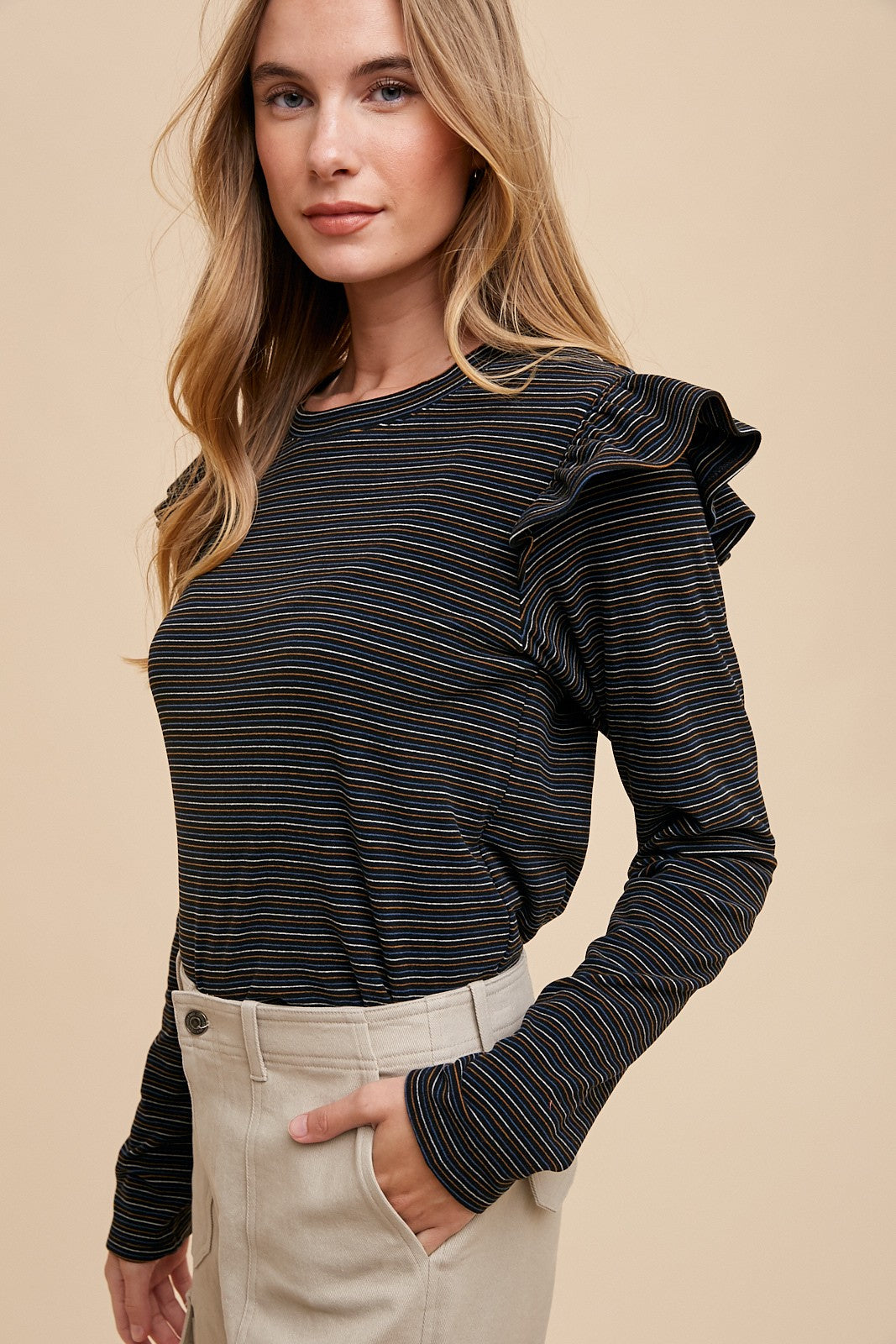 Brushed, stripe top with ruffled shoulders.