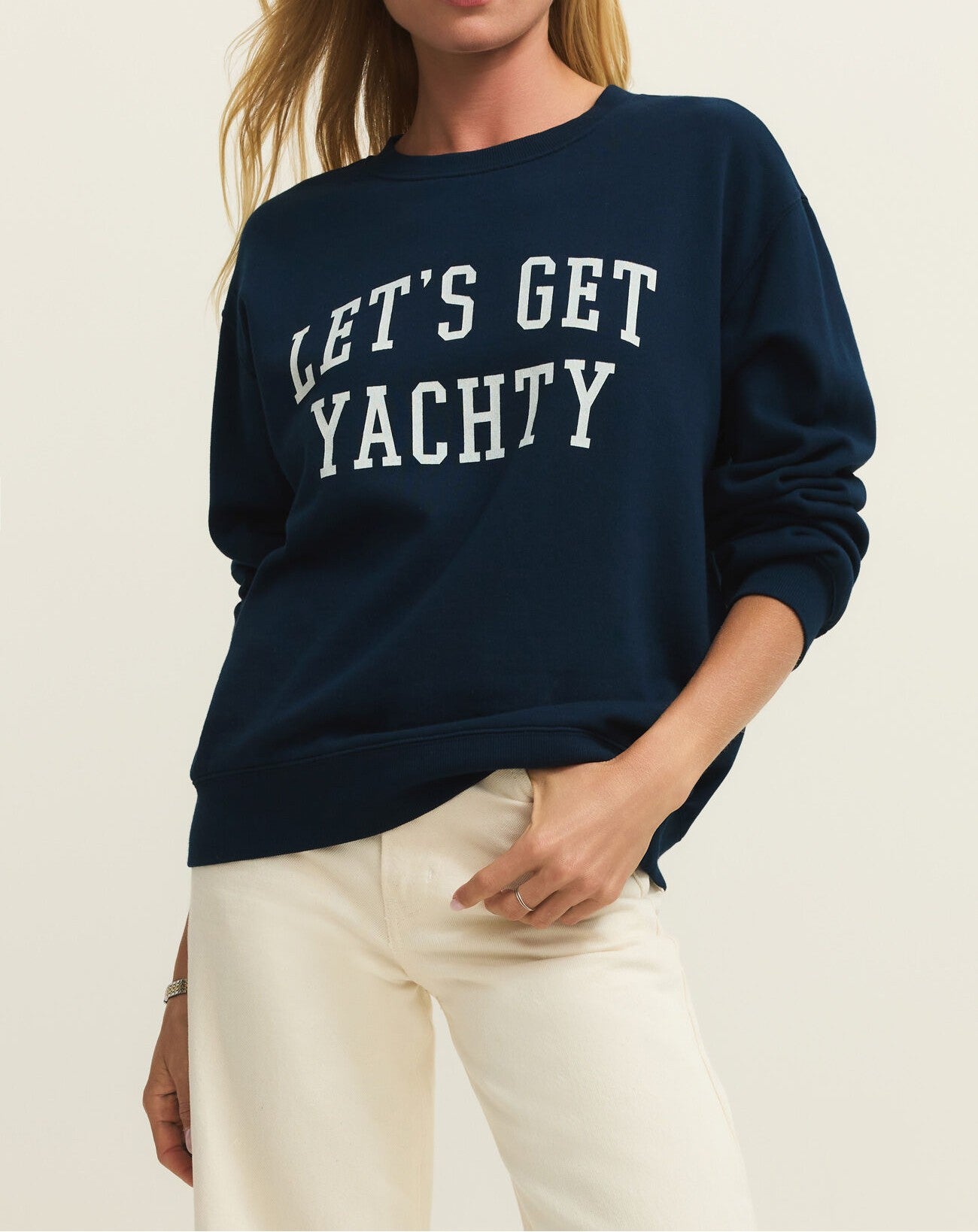 This midweight cotton crewneck says it all with its relaxed fit, brushed fleece interior, and “Let’s Get Yachty” print. We love its rich navy hue that will carry you through all seasons.